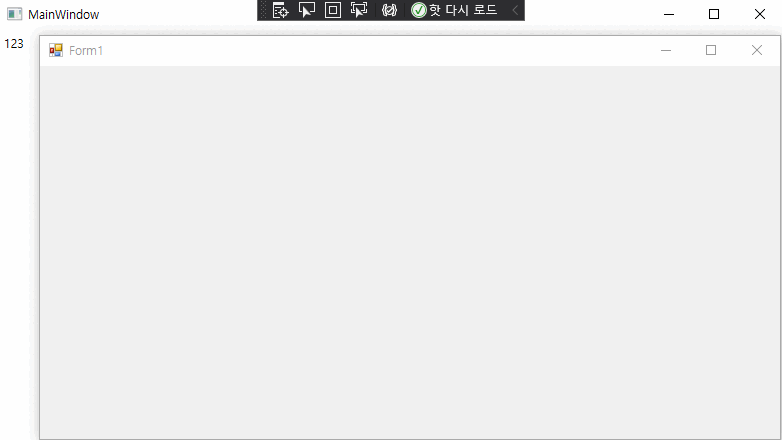 ![]() (WPF에 Winform 삽입) form1이 MainWindow 앞에 위치 |