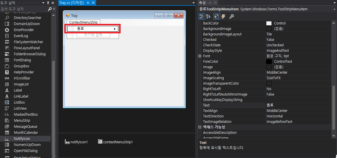 코드 및 디자이너는 아래와 같습니다.. 디자이너에서 트레이 아이콘 설정을 해주면 완료!