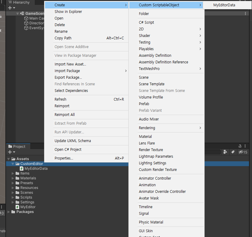 생성을 위해 CreateAssetMenu 를 설정해주겠습니다.