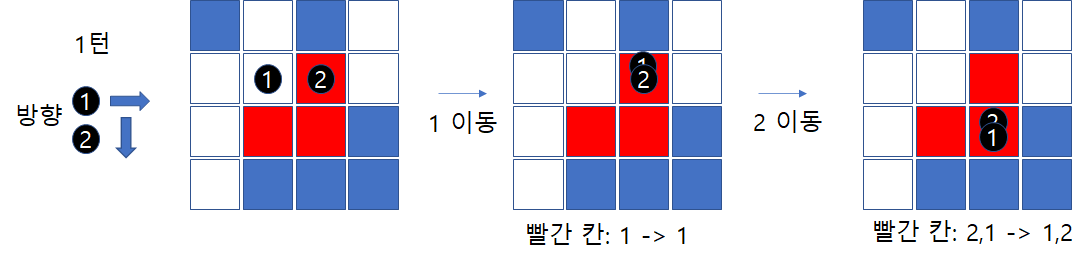 만약 (맨 밑)1, 2로 이루어진 말이 있는데 이 말이 빨간 칸에 가게 되면