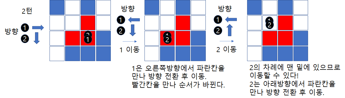 빨간색 칸은 이동하기 전에 1,2,3 순서라면 3,2,1 순서로 변경하여 이동,