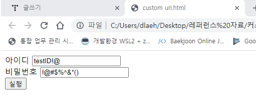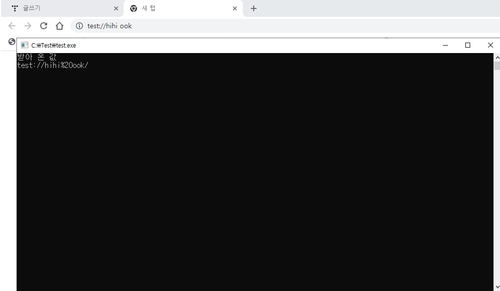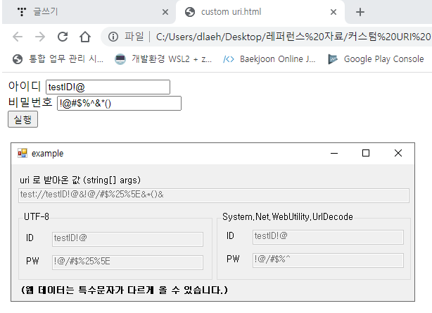 let url = "Test://" + id + "&" + pw + "&"; // 레지스트리에 등록 된 Test:// 호출 부분입니다.