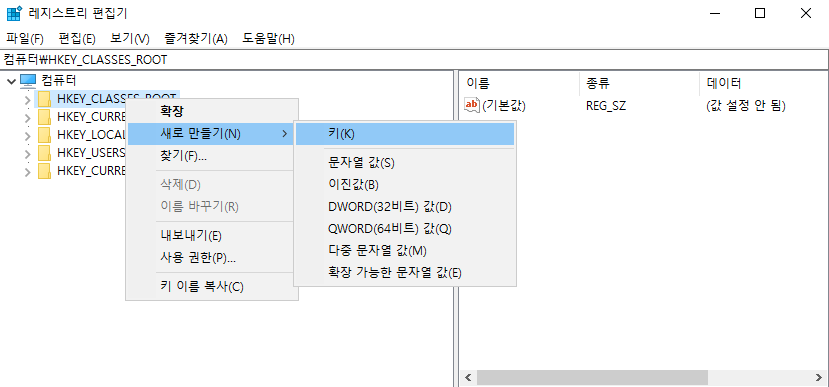 3. HKEY_CLASSES_ROOT 오른쪽 클릭 후 새로 만들기 -> 키 를 선택해줍니다.