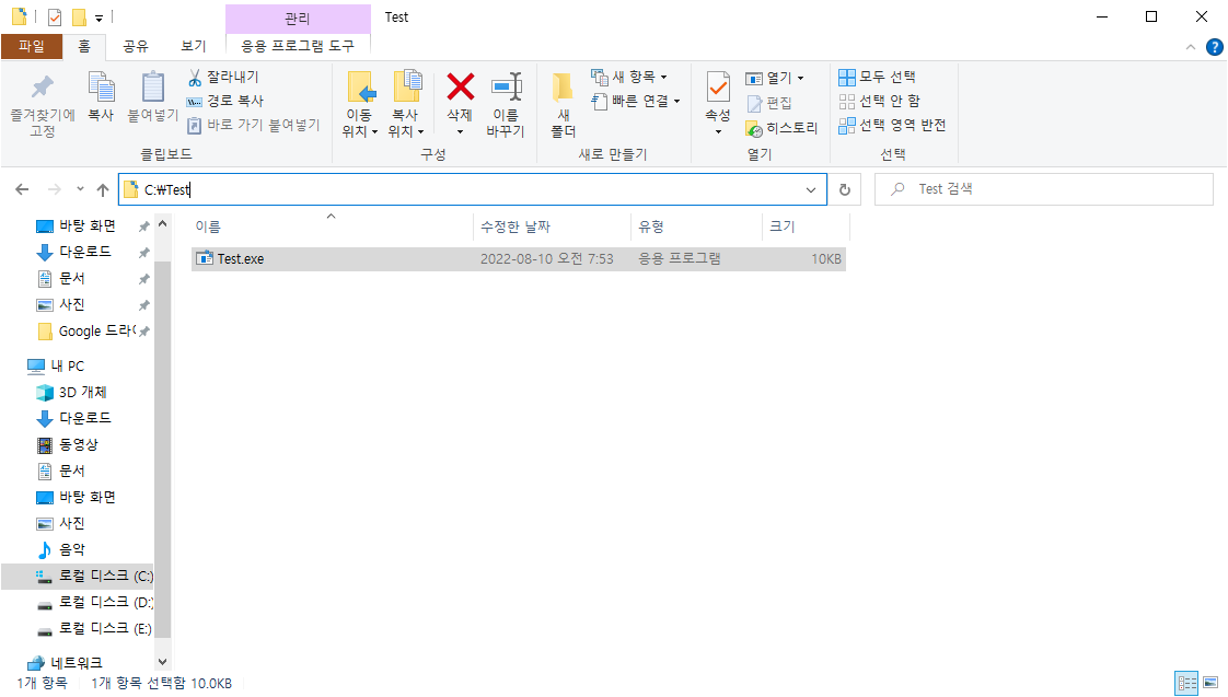 8. 해당 파일을 C:\Test\Test.exe 로 옮겨줍시다.