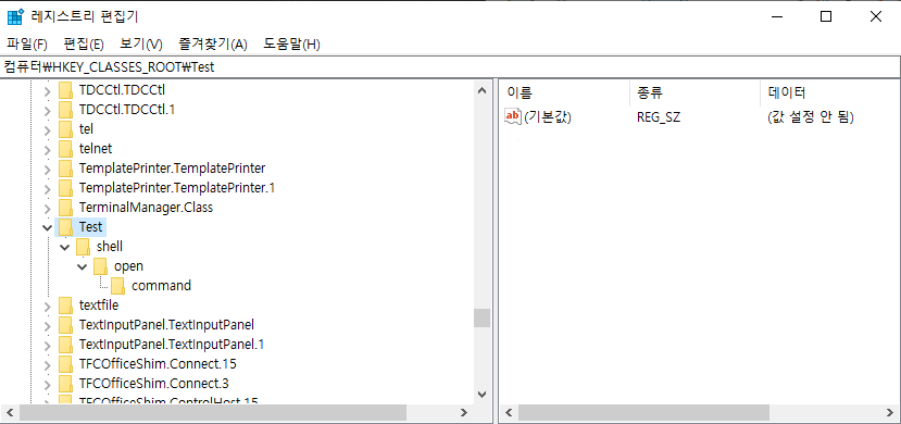 C드라이브 테스트 폴더의 test.exe 실행을 하고, %1은 실행 시 매개변수 값을 하나 줄 수 있다는 의미입니다.