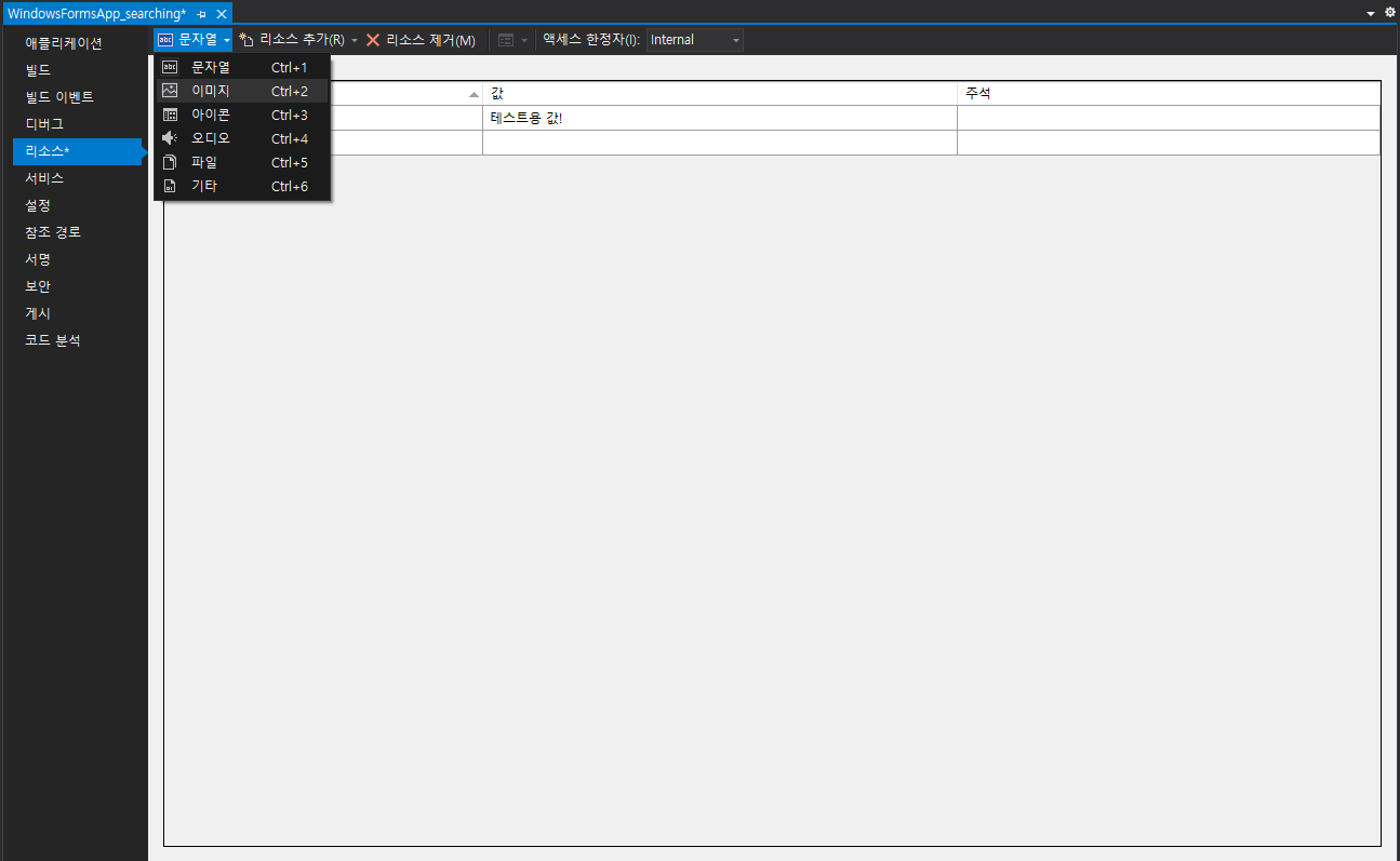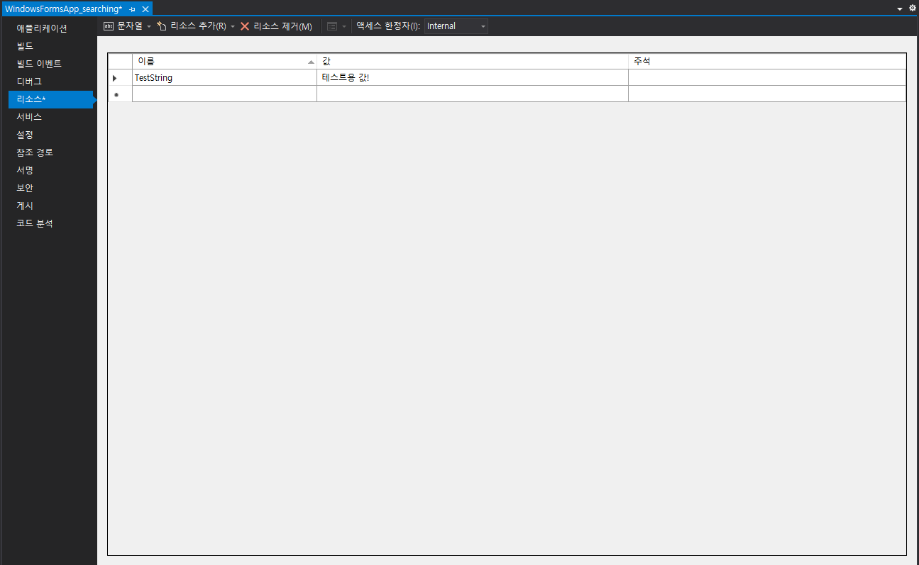 2. 리소스 탭을 클릭하면 기본 문자열에 대해 입력이 가능해집니다.