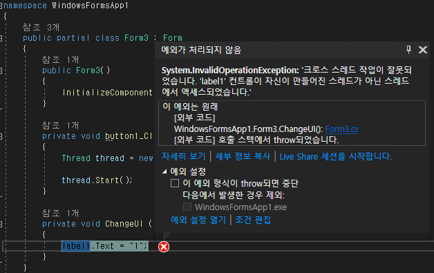 Windows Form에서 UI는 메인 스레드에서만 변경이 가능하며 그 외의 접근에 대해서는 예외가 발생됩니다.
